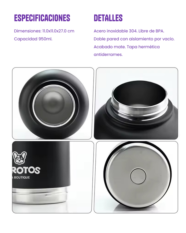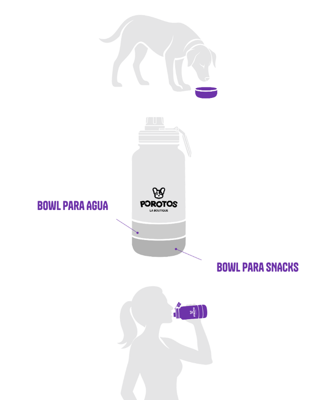 . Capacidad de 950ml . 3 en 1: Hidratación por boca, bowl para agua y bowl para snaks. · Tapa a prueba de fugas. · Acero inoxidable 304. . Aislamiento al vacío de doble pared. . Bowl 1 Acero inoxidable. . Bowl 2 Acero inoxidable. · Tapa hermética antiderrames. . Manija de fácil transportación. . Frio de 12 a 24hs. . Caliente hasta 12hs. . Libre de BPA. . Dimensiones: 27x11xl1cm