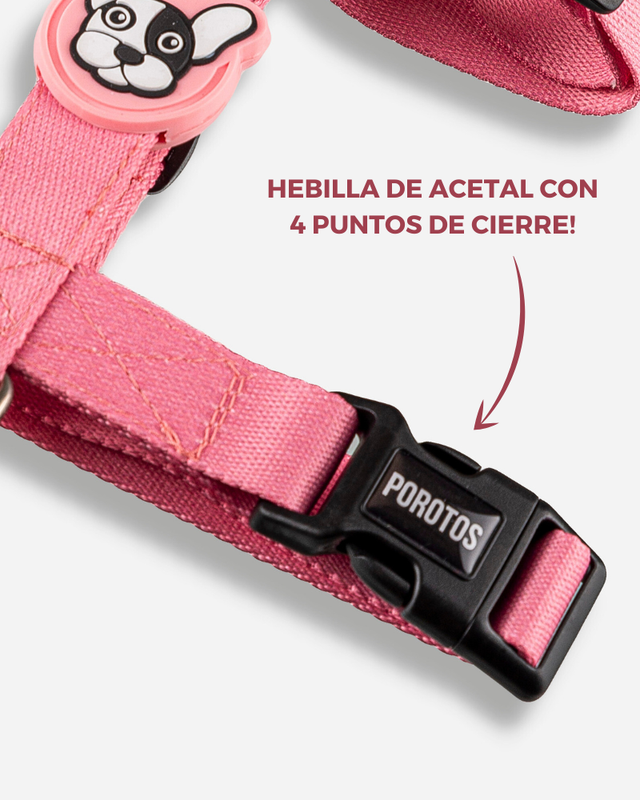 . Disenado en formato H, para que el perro no pueda sacarselo sólo y para que pueda pasear con sus articulaciones liberadas. · Cinta de poliester estampada de alta resistencia/tenacidad. . Hebilla curva de acetal que se adapta perfectamente al cuerpo y con seguridad de 4 puntos de cierre avalada por normas ISO. . Goma Doble protectora de costuras para mayor resistencia y detalle estético. · Medialuna con soldadura reforzada. · Regulable según tabla de talles para ajustar las cintas perfectamente al cuerpo.