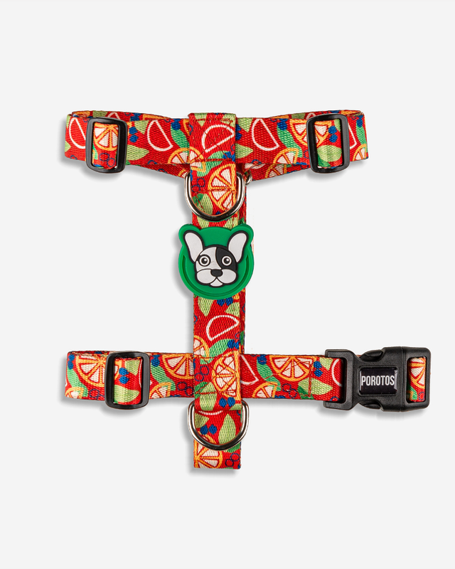 . Disenado en formato H, para que el perro no pueda sacarselo sólo y para que pueda pasear con sus articulaciones liberadas. · Cinta de poliester estampada de alta resistencia/tenacidad. . Hebilla curva de acetal que se adapta perfectamente al cuerpo y con seguridad de 4 puntos de cierre avalada por normas ISO. . Goma Doble protectora de costuras para mayor resistencia y detalle estético. · Medialuna con soldadura reforzada. · Regulable según tabla de talles para ajustar las cintas perfectamente al cuerpo.
