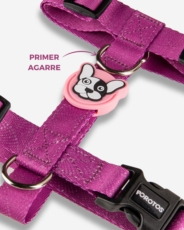 . Disenado en formato H, para que el perro no pueda sacarselo sólo y para que pueda pasear con sus articulaciones liberadas. · Cinta de poliester estampada de alta resistencia/tenacidad. . Hebilla curva de acetal que se adapta perfectamente al cuerpo y con seguridad de 4 puntos de cierre avalada por normas ISO. . Goma Doble protectora de costuras para mayor resistencia y detalle estético. · Medialuna con soldadura reforzada. · Regulable según tabla de talles para ajustar las cintas perfectamente al cuerpo.