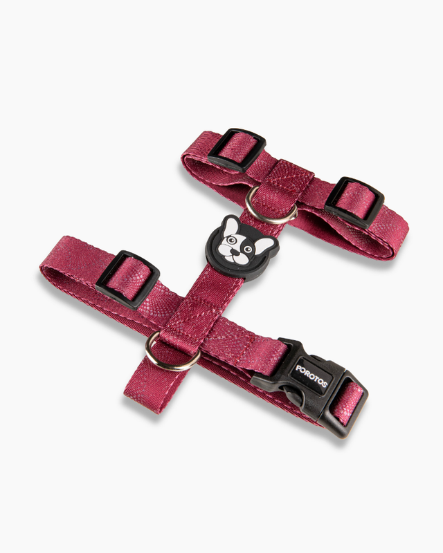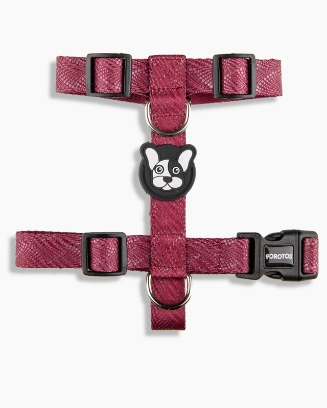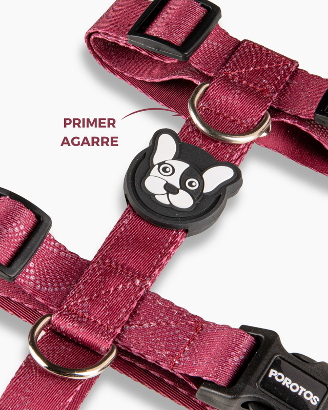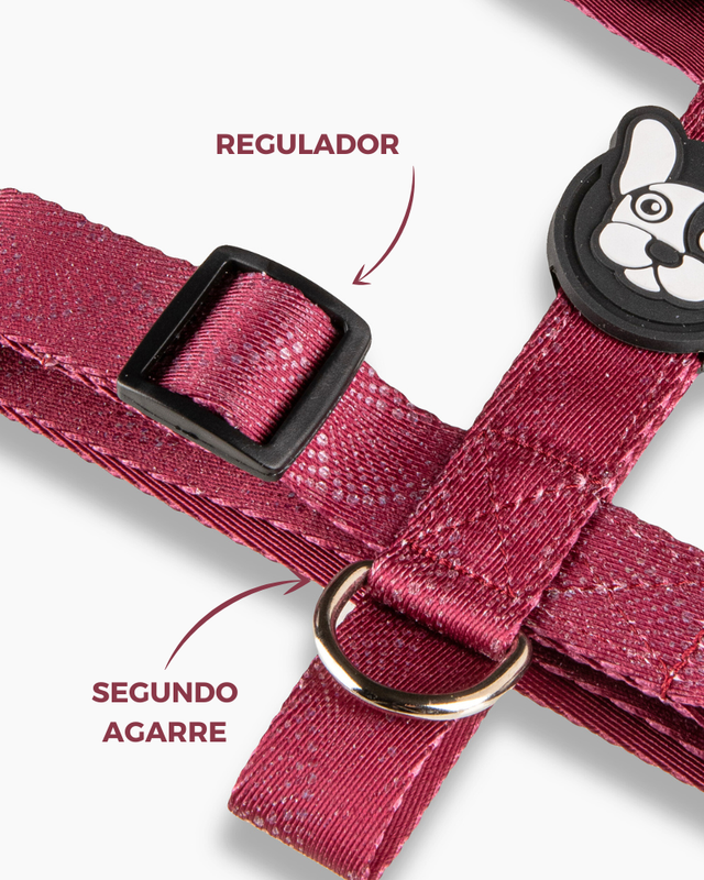 . Disenado en formato H, para que el perro no pueda sacarselo sólo y para que pueda pasear con sus articulaciones liberadas. · Cinta de poliester estampada de alta resistencia/tenacidad. . Hebilla curva de acetal que se adapta perfectamente al cuerpo y con seguridad de 4 puntos de cierre avalada por normas ISO. . Goma Doble protectora de costuras para mayor resistencia y detalle estético. · Medialuna con soldadura reforzada. · Regulable según tabla de talles para ajustar las cintas perfectamente al cuerpo.