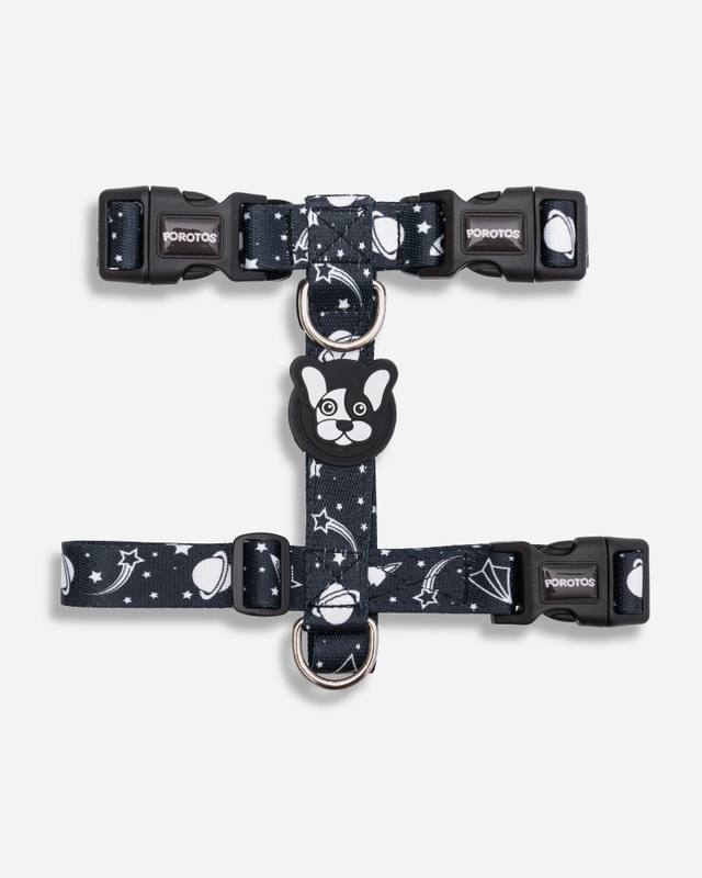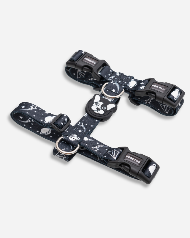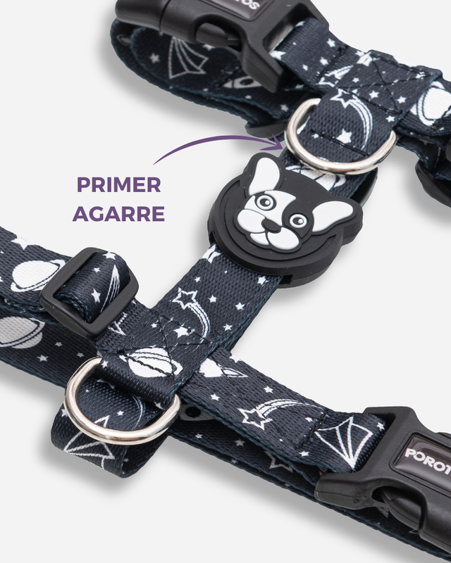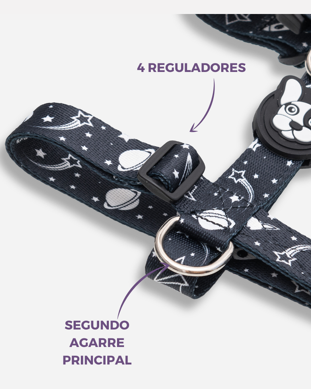 · Diseñado en formato H, para que el perro no pueda sacarselo sólo y para que pueda pasear con sus articulaciones liberadas. · Cinta de poliester estampada de alta resistencia/tenacidad. · 3 Hebillas curvas de acetal que se adapta perfectamente al cuerpo y con seguridad de 4 puntos de cierre avalada por normas ISO. · Goma Doble protectora de costuras para mayor resistencia y detalle estético. · 2 Medialunas con soldadura reforzada. . Regulable según tabla de talles para ajustar las cintas perfectamente al cuerpo.