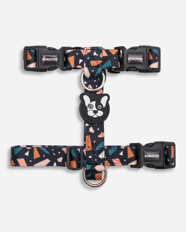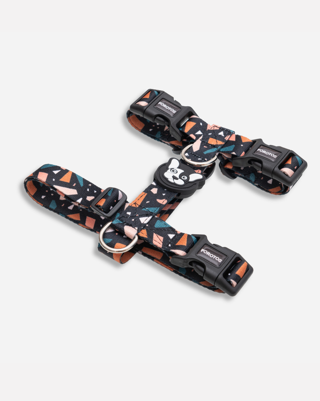 · Diseñado en formato H, para que el perro no pueda sacarselo sólo y para que pueda pasear con sus articulaciones liberadas. · Cinta de poliester estampada de alta resistencia/tenacidad. · 3 Hebillas curvas de acetal que se adapta perfectamente al cuerpo y con seguridad de 4 puntos de cierre avalada por normas ISO. · Goma Doble protectora de costuras para mayor resistencia y detalle estético. · 2 Medialunas con soldadura reforzada. . Regulable según tabla de talles para ajustar las cintas perfectamente al cuerpo.